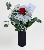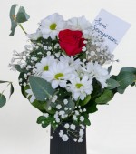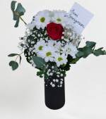 Sevginizi en saf ve zarif haliyle ifade edin! ❤️ Sevgi Bahçesi Buketi, beyaz papatyaların masumiyeti ve kırmızı gülün tutkulu ifadesiyle, duygularınızı en içten şekilde anlatıyor. Siyah şık vazo içinde sunulan bu özel tasarım, her anı unutulmaz kılmak için mükemmel bir seçim!